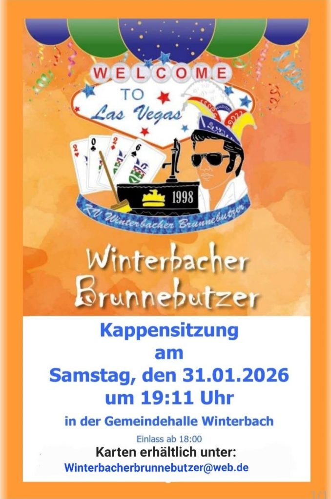 Unter dem Motto – „Welcome to Las Vegas“ findet unsere Kappensitzung am Samstag, den 31. Januar um 19:11 Uhr, in der Gemeindehalle in Winterbach statt. Wir bitten die Plätze bis 18:30 Uhr einzunehmen. Kostümierung erwünscht.